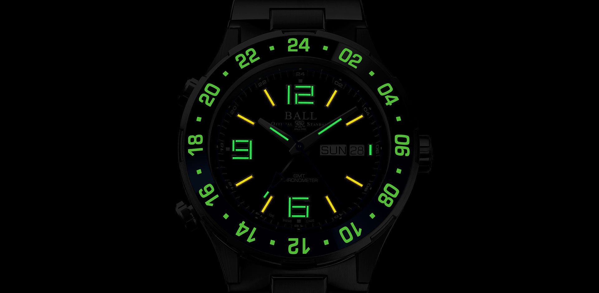 MICRO GAS TUBES: 28 micro gas tubes on hour, minute and GMT hands and dial for night reading capability