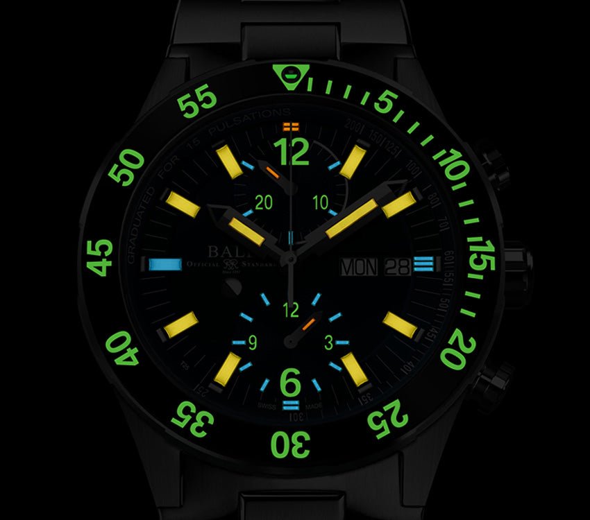 - Unidirectional rotating stainless steel bezel with ceramic insert and gas tube inset