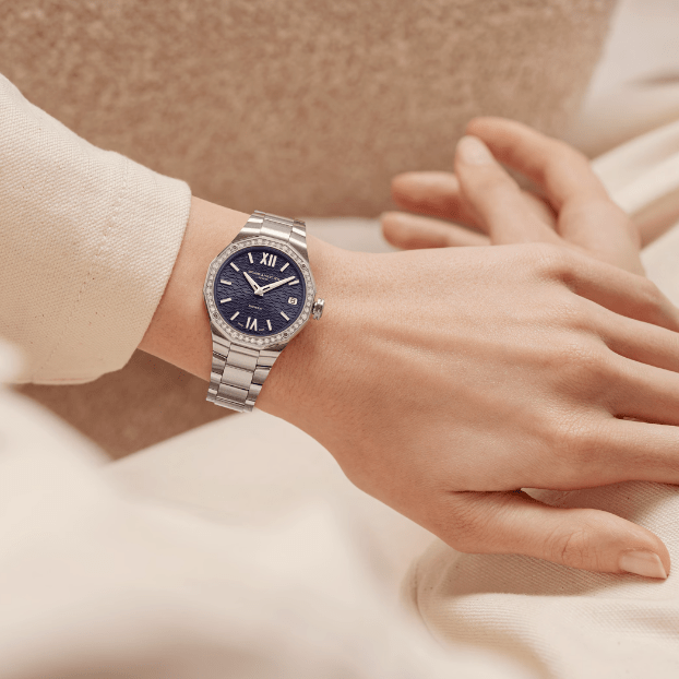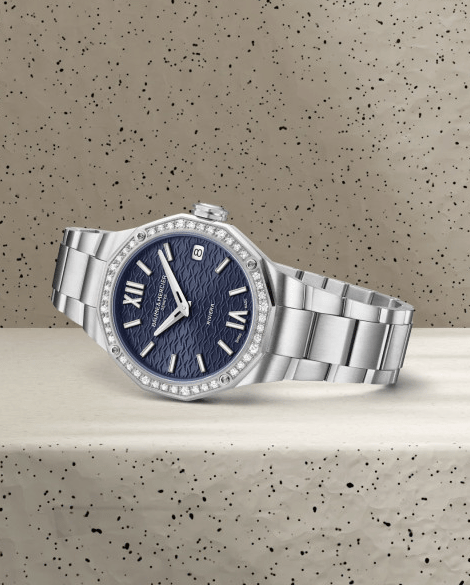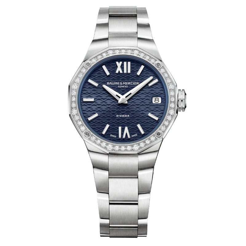 The Riviera 10765 shines like any other. Equipped with a sun satin-finished and polished stainless steel bezel set with 44 diamonds, this timepiece features a night blue dial and transparent waves decor. With the addtion of its metal bracelet, this timepiece is a symbol of refinement.