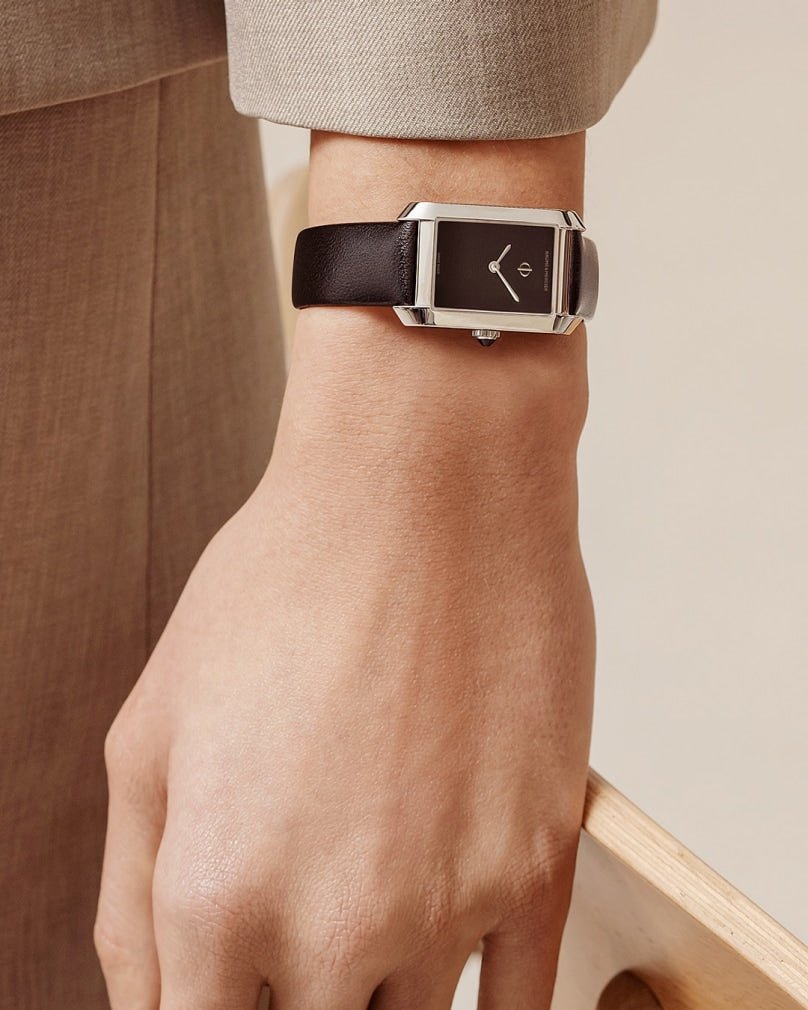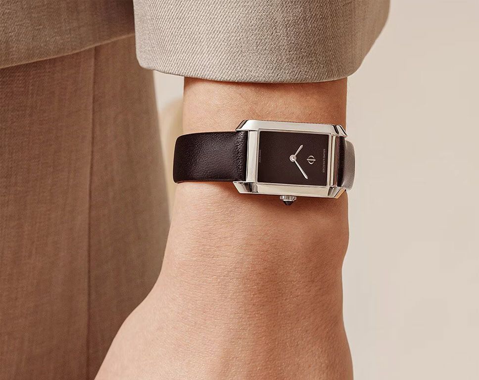 With its sleek black dial, rectangular steel case, and black calfskin strap, the Hampton 10760 epitomizes the pure elegance of black. This new addition to the Hampton Collection pays homage to the Maison's artistic vision, blending innovation and rigor to redefine the essence of timekeeping. This refined Hampton combines timeless style with long-lasting quartz movement, promising to grace wrists with elegance for years to come.
