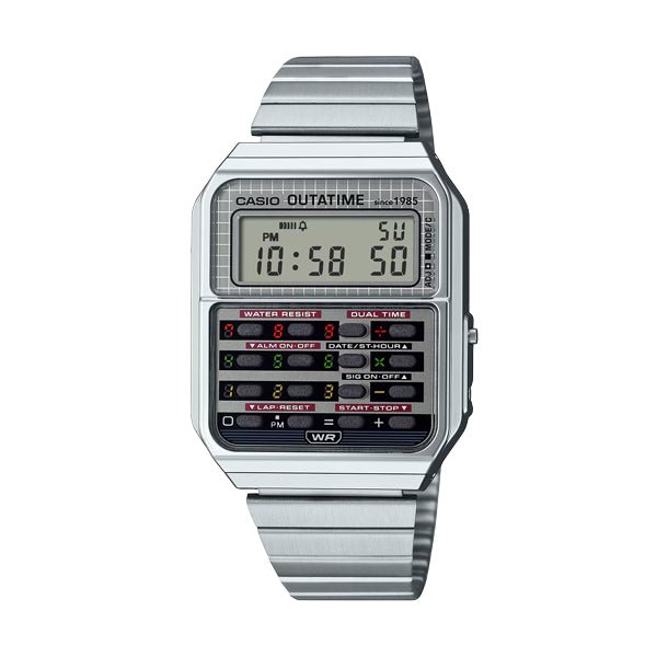 Time travel in contemporary vintage style! Introducing a dream collaboration between Casio Vintage and Back to the Future. 2025 marks the 40th anniversary of the release of Back to the Future, and timeless icon Casio Vintage helps celebrate with a very special watch that embodies this classic futuristic adventure. The CA-500, the ever-popular Casio calculator model, as loved now as it was in the 1980s, takes on a Back to the Future DeLorean theme. The different colors around the buttons evoke the DeLorean’s time circuits for setting the destination date and time, transporting you into the world of the film every time. The case back is engraved with the flux capacitor, the iconic piece of fictional technology that turns the DeLorean into a time machine. This singular collaboration is packed with meticulous details, like the Back to the Future logo on the band buckle, that will thrill the film’s fans. Yet the silvery case and band deliver a refined look as welcome in the office as the movie theater. The watch comes in special packaging designed to look like a vintage videotape, capturing the world of the film — a very special item worthy of any collection. Transport yourself to the Back to the Future world with a touch of subtle playfulness that adds a sense of playful adventure to your minutes, hours, and days. Back to the Future Released in 1985, the sci-fi classic Back to the Future celebrates its 40th anniversary in 2025. Directed by Robert Zemeckis, with Steven Spielberg as executive producer, the film tells a humorous and thrilling story of time travel and familial love. In this timeless classic beloved by all ages, the protagonist Marty McFly, played by Michael J. Fox, boards a time machine built by the genius scientist Doc, portrayed by Christopher Lloyd. The audience watches, rapt and thrilled, as Marty journeys “back to the future,” racing against time to restore the future he once knew. Today, 40 years later, this enduring classic still stands the test of time, carrying a timeless message and hope for the future.