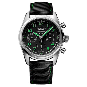 Longines adds to its Longines Spirit collection a new Grade 5 titanium chronograph, intended for the brand’s most popular outlets. The lightweight piece is presented on a black synthetic strap with neon green stitching that matches the matt black dial’s hands and Arabic numerals, which are coated in Super-LumiNova® for optimal visibility. The 42.00 mm titanium case houses an exclusive COSC-certified automatic movement (L688.4) with a silicon balance-spring. The caseback is engraved with the words “PIONEER EDITION”.