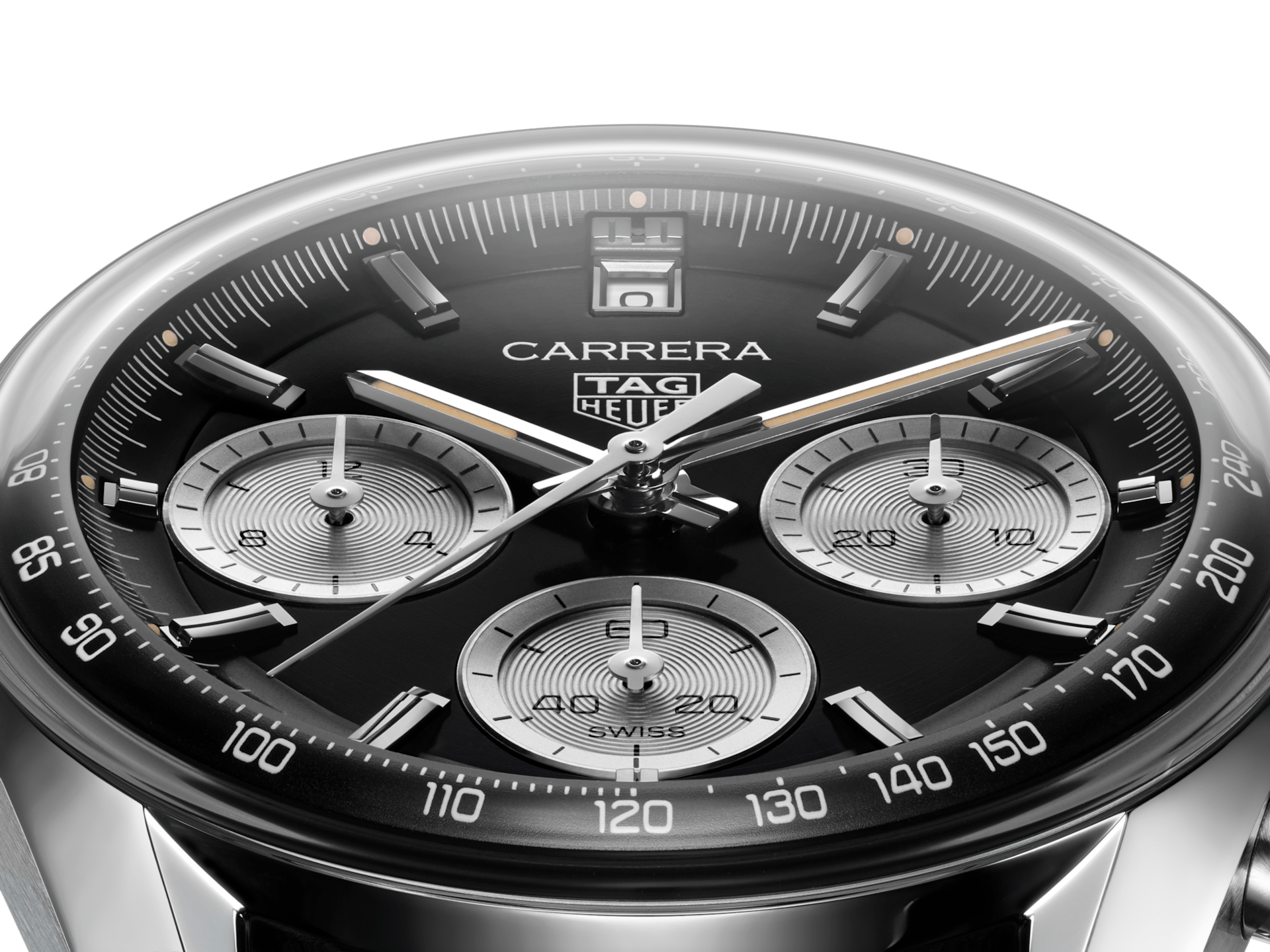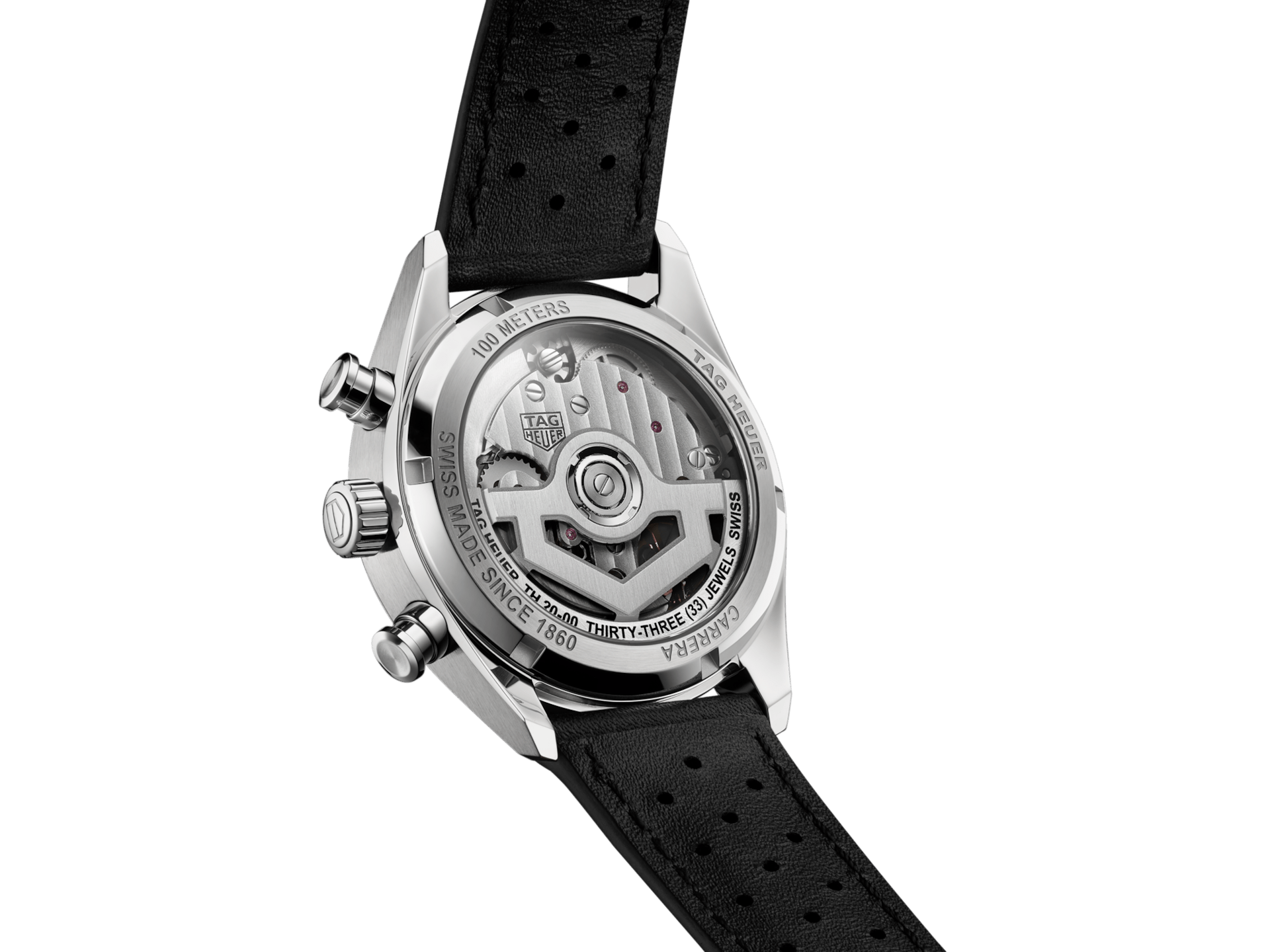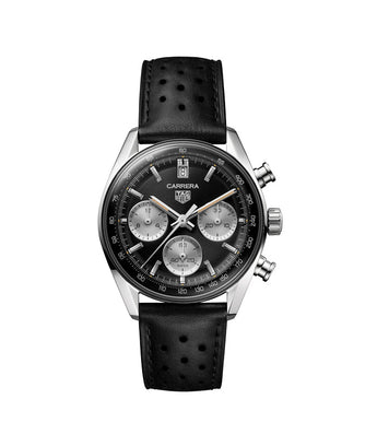 Reimagined from the reverse panda 2447 NS model, this prestigious black 39mm version of the TAG Heuer glass box encapsulates the Carrera’s signature design with a modern twist. With its luxurious perforated calfskin leather strap, this watch is resolutely driven to dare.