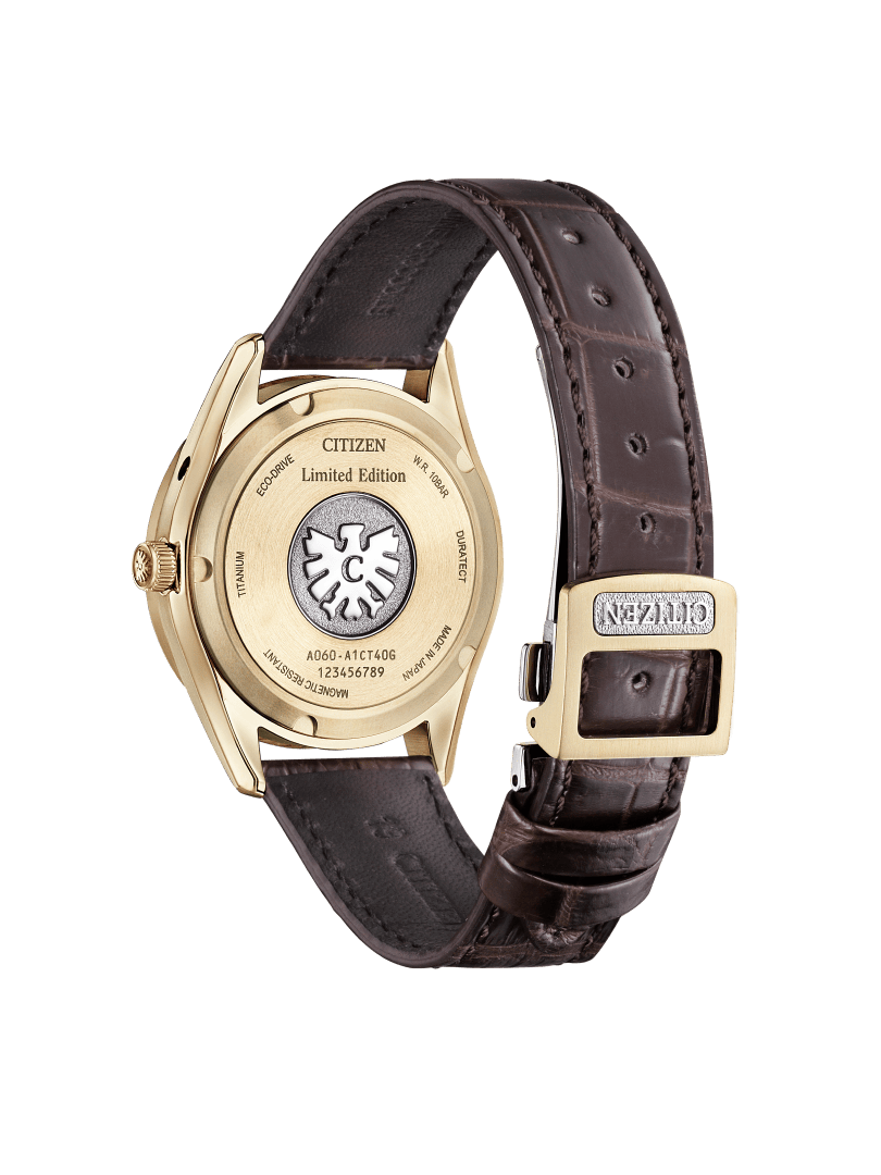 The AQ4103-16W is a model inspired by the spectacular moment when the setting sun creates a golden glow along the ridge of a mountain. The black washi paper dial features a kasure brushstroke effect created with gold leaf together with a brown gradient that is reminiscent of autumn colors. The case is made of Super Titanium™*2 finished with Duratect Amber Yellow*3, a newly developed surface hardening technology with an elegant amber yellow color.