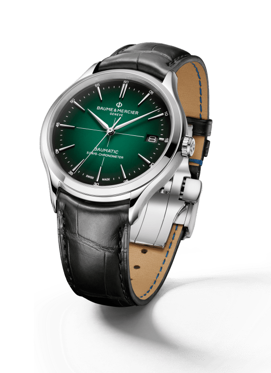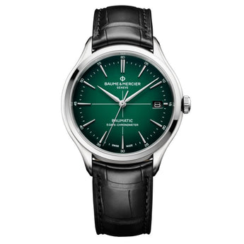 A Clifton Baumatic COSC certified chronometer, this attractive timepiece combines the cool look of a polished steel case with the depth of the gradient green dial. The black alligator strap is interchangeable, allowing for seamless style versatility.