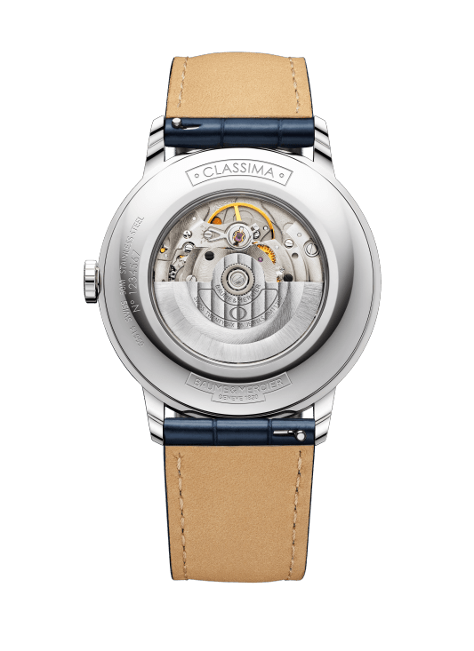 Blued steel hands sweep around the opaline silver-colored dial, styled with line guilloché décor and Roman numerals, in this Swiss-made timepiece. The Classima 10333 is a men’s automatic watch designed with masculine refinement in mind. The blue leather strap with an alligator pattern perfectly balances the clean lines and smooth appearance of the watch face. Glimpse the mechanical self-winding movement from behind the clear sapphire case back.