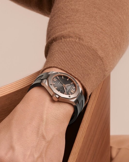 Sporty, dressy, casual, this Riviera is a multifaceted timepiece that will please many personalities. Equipped by a "swiss-made" automatic movement, the combination of its steel case, sandblasted titanium bezel and gilt ring brings boldness to this timepiece. The perfect choice for people looking for versatility.