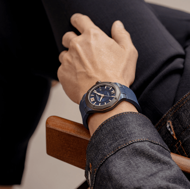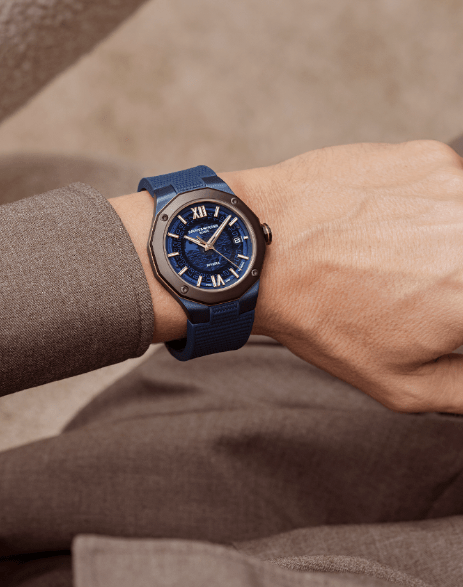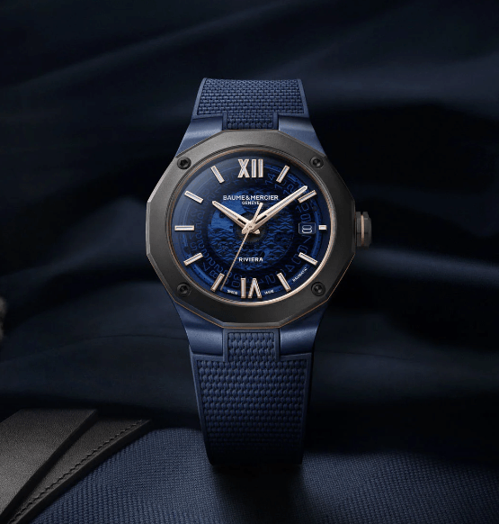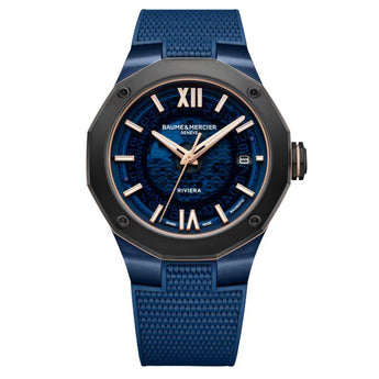 The Riviera Baumatic 10769 embodies the mineral facet of the Riviera by featuring a steel case paired with a sandblasted titanium bezel. This 42mm timepiece houses a manufacture Baumatic movement ensuring precision and durability, complemented by a sapphire blue dial and a blue interchangeable rubber strap with canvas decor.