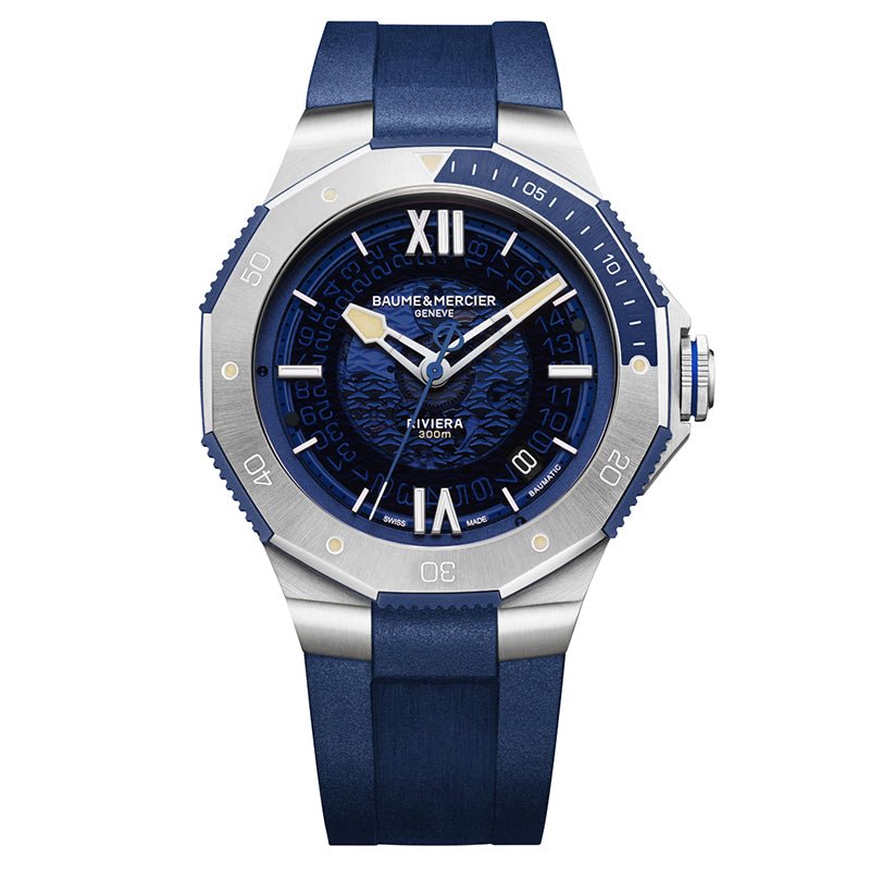 Driven by the prestigious Baumatic manufacture calibre, the Riviera 10716 is the all-road Swiss timepiece by excellence. Its transparent smokey blue sapphire dial, its unidirectional rotating bezel and its blue anodized aluminum ring complete the sporty look of this "Swiss-Made" timepiece. The ideal watch for water sports.