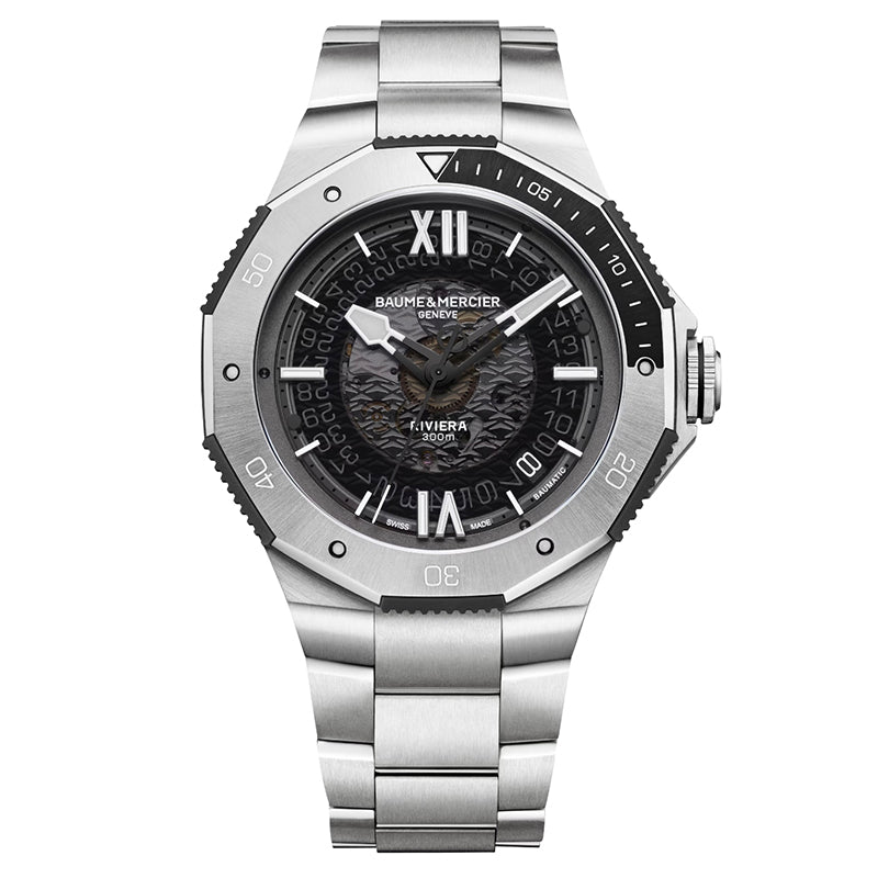 Driven by the prestigious Baumatic manufacture calibre, the Riviera 10717 is the all-road Swiss timepiece by excellence. Its transparent smokey grey sapphire dial, its unidirectional rotating bezel and its black anodized aluminum ring complete the sporty look of this "Swiss-Made" timepiece. The ideal watch for water sports.