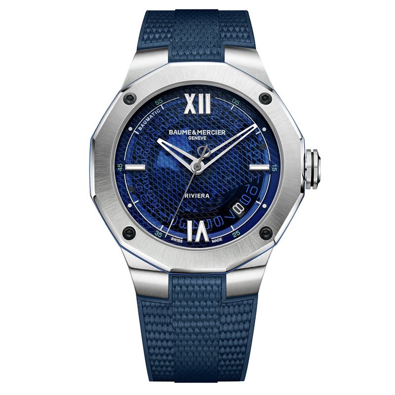 Driven by the prestigious Baumatic manufacture calibre, the Riviera 10701 is the all-road Swiss watch by excellence. Its transparent smokey blue sapphire dial with mesh decor, its open-worked hands, sandblasted screws and blue rubber strap with canvas decor complete sporty look of this Swiss made timepiece.