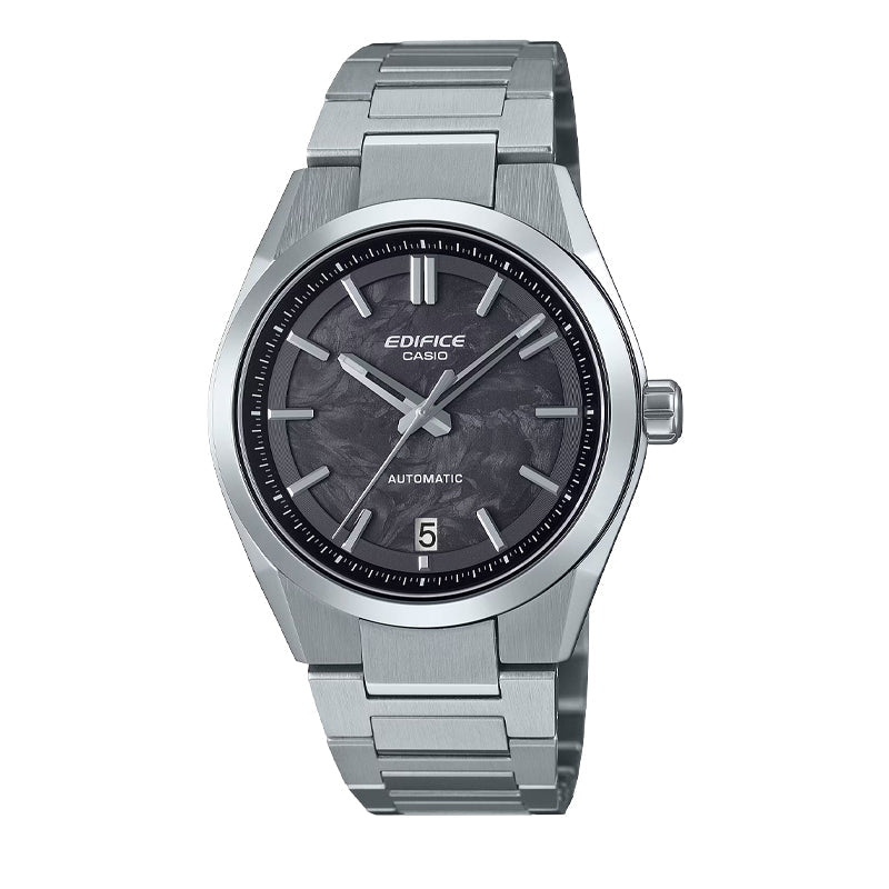 Crafted for true sports car enthusiasts and GT car fans — the EFK-100CD, a sleek three-hand analog watch, embodies the EDIFICE spirit of synergy between timepiece engineering and the world of high-performance cars. Electroforming reproduces the look of forged carbon on the dial for a uniquely textured, sporty, yet refined look. The sapphire crystal enhances visibility, while dynamic touches like raised indexes and sharp bezel and case complete the sophisticated design. The mechanical movement with 40-hour reserve powers the watch hands like a humming sports car engine, all housed in a compact 39mm case. The see-through case back reveals the movement in motion, reinforcing the unique charms of a mechanical watch. Water resistance up to 100 meters leaves you free to focus on more exciting things.