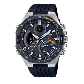 Hold your own, with true motorsports form, functionality, and sophistication in an EDIFICE racing multicolor timepiece. The bold dial is accented with colorful touches inspired by the layout of race car steering wheels. The second hand and other color-coded components ensure the stand-out visibility that racing teams need for split-second decisions and quick action. The soft urethane band delivers an extremely comfortable fit, leaving you free to focus on more exciting things. Sync with your smartphone via Bluetooth® for precision timekeeping, wherever you go. Simply tap on the app to effortlessly manage functions like selecting a city from the World Time list. The large inset dial at the 4 o’clock position boasts a speed indicator that displays average speeds when timing laps for set distances. The fully automatic LED light illuminates the dial and LCD with just a tilt of the wrist. Tough Solar charges the watch from sunlight or even fluorescent lamp light