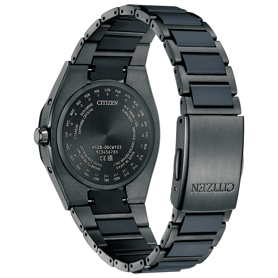 ■Cal.H128/ Accuracy of ±15 seconds per month (withouttime signal reception)/ Eco-Drive running for 5 years on full charge (in power save mode) / Global Radio-Controlled / Power Reserve Indicator / Perpetual Calendar ■ Luminous (Hands) ■ W.R. 10 BAR |