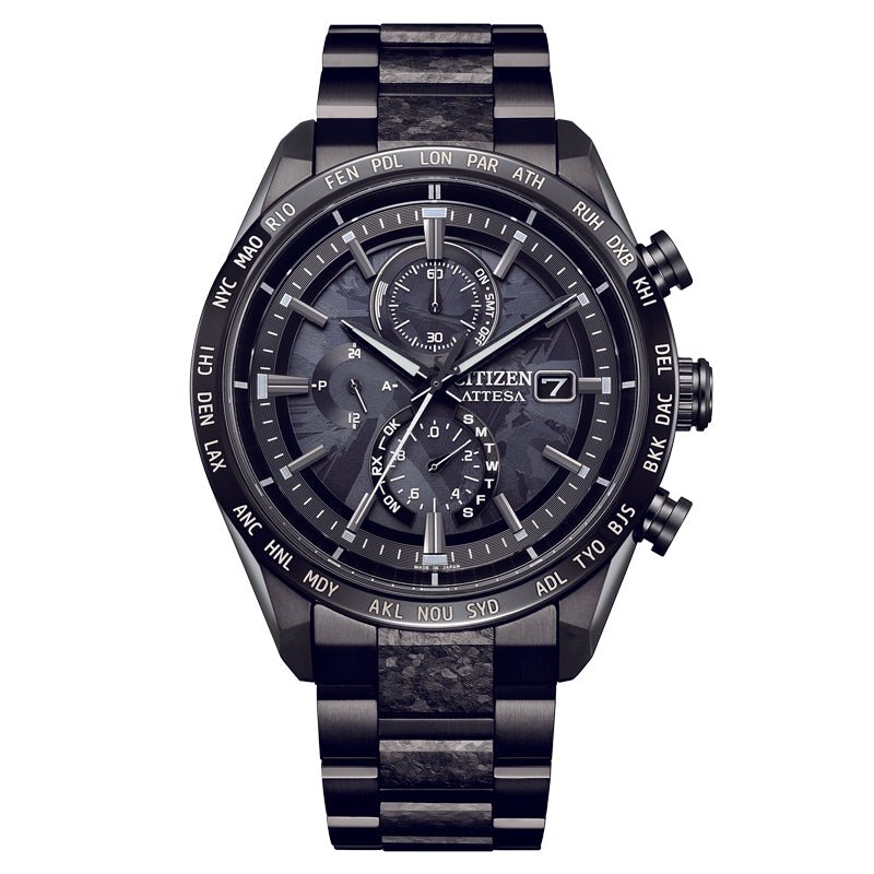 Specifications | ■Cal.H800/ Accuracy ±15 seconds per month (without time signal reception) / Eco-Drive running for 10 months on full charge (in power save mode) / Global Radio- Controlled / World Time functionality / Chronograph / Perpetual Calendar / Light Level Indicator ■ Luminous (Hands+Index) ■ W.R. 10 BAR |