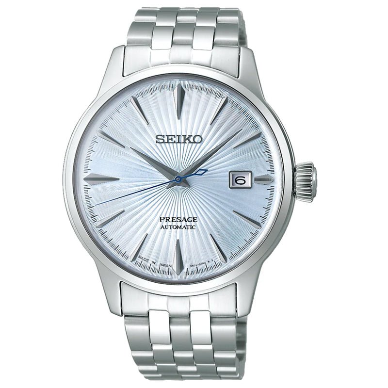 The Seiko Presage Cocktail Time SRPE19J1 Automatic Watch features a 40.5mm stainless steel case with a light blue sunburst dial inspired by Japanese cocktail culture. Powered by the 4R35 automatic movement with a 41-hour power reserve, it offers three-hand timekeeping, date display, and hand-winding capability. The design includes a box-shaped Hardlex crystal, see-through case back, and 50-meter water resistance, paired with a stainless steel bracelet for timeless elegance.