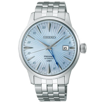 Seiko Presage ‘Skydiving’ Cocktail Time GMT is part of Seiko's first-ever Cocktail Time collection with GMT functionality, inspired by Tokyo’s Ginza cocktail scene. Named after the refreshing Skydiving cocktail, a mix of rum, lime juice, and blue curaçao, the watch’s light blue sunray dial captures the elegance of a cocktail glass, while the GMT hand evokes a glass stem and the second hand resembles a cocktail stirrer.