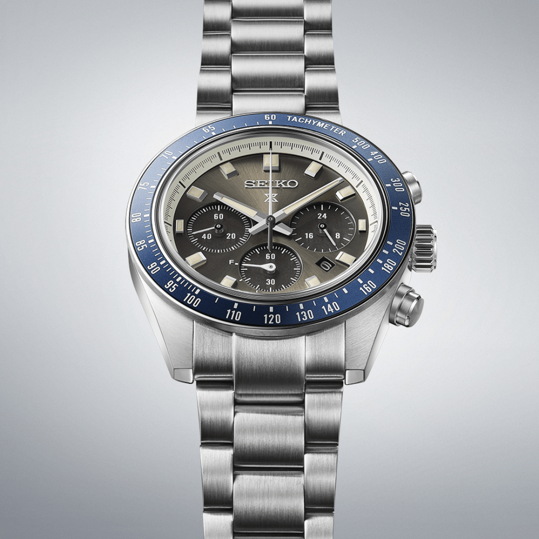 Encased in a navy-blue aluminium bezel and sapphire crystal glass, this chronograph features a clean-cut grey dial, with hour and minute hands that resemble the original Speedtimer from 1969. With 12 spots of Lumibrite, this timepiece is designed to be legible in darker conditions. With a chronograph second scale around the dial ring, this piece also features a Tachymeter on the bezel for measuring speed – an iconic element of the original Seiko Speedtimer.