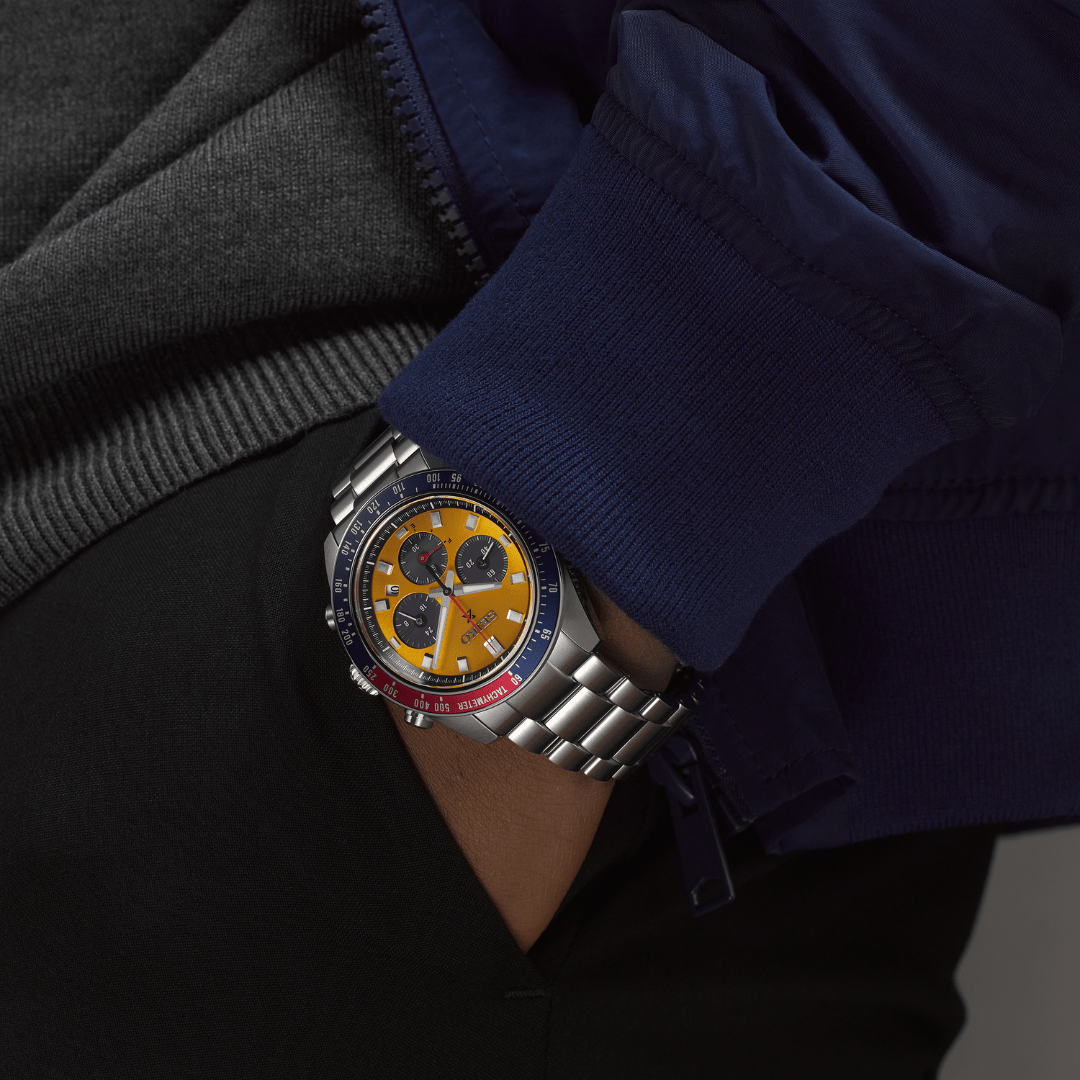 Under a curved sapphire crystal glass is a vivid yellow dial, characteristic of the 6139 original, the second hand, and subdial minute hand at 6 o’clock are in a bright red. With 12 spots of Lumibrite across each of the wide vintage-style indices, this Speedtimer is designed for legibility in dark conditions. In the style of the original, this piece has a blue and red aluminium bezel with a tachymeter feature and a chronometer second scale on the inside dial ring. The bracelet is tapered from the lugs all the way to the buckle.