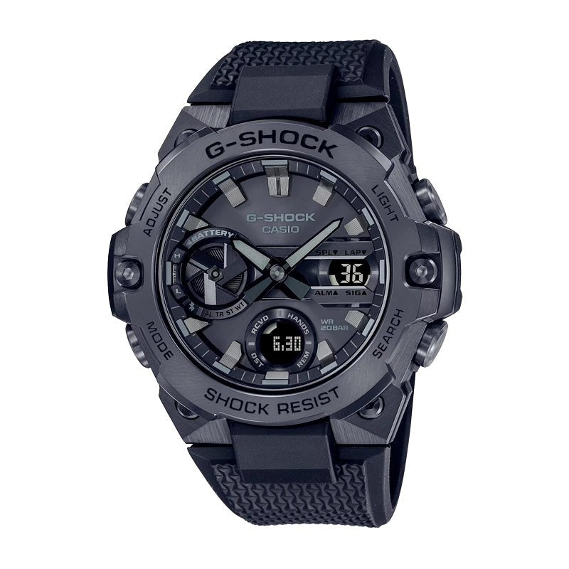 Revel in eclectic sophistication with the G-STEEL fusion of metal and resin components in a popular all-black G-SHOCK. Tough construction meets stylish design in a black ion-plated metal bezel set against a base of jet black. With its slim combination module and Carbon Core Guard structure, the black-on-black take of the GST-B400 is a cool fashion statement ready for whatever you are.