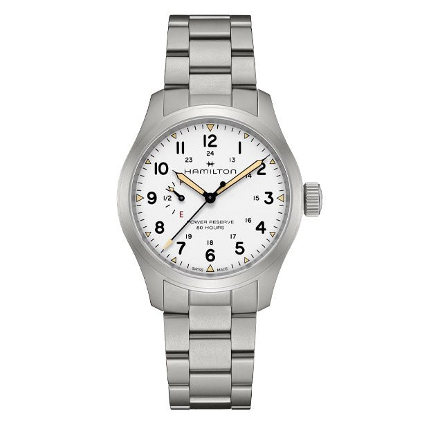 The Khaki Field Mechanical Power Reserve 40mm honors the heritage design and essential functionality of the Khaki family, while introducing modern features and the latest in watchmaking technology and innovation. With a new manual-winding H-23 movement, developed by ETA exclusively for Hamilton, it allows (for the first time) for the 80-hour power reserve to be visualized directly on the dial. Fitted with a stainless steel metal bracelet, the white dial proudly displays "power reserve 80 hours" and shows "F" for full and "E" for empty, to underscore this exceptional and utility-focused feature.