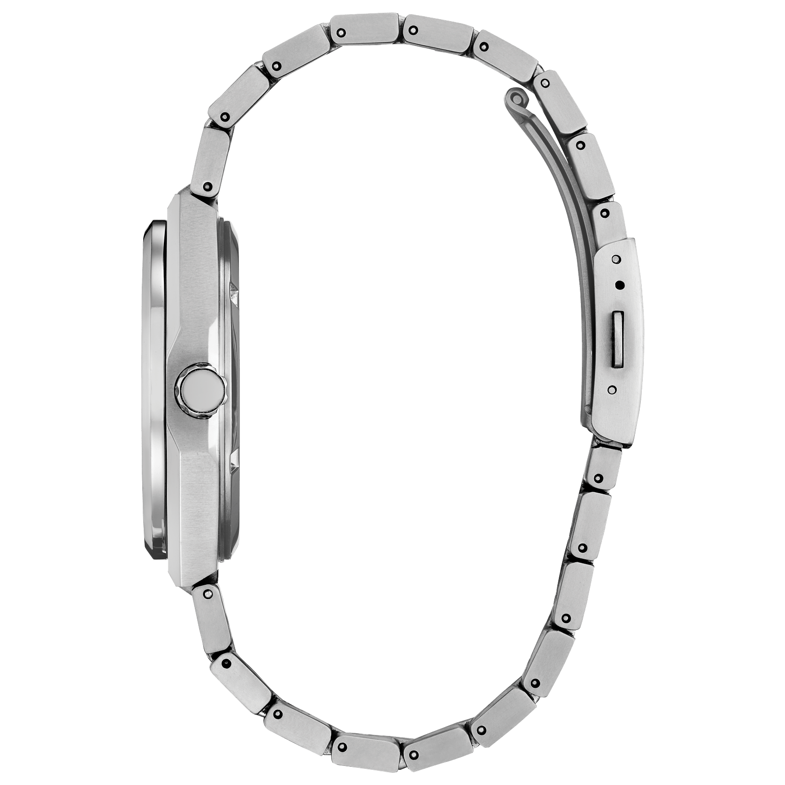Pairing classic proportions and innovative technology with a distinctly modern style, we present our new Integrated Super Titanium™ Automatic series. Made with our proprietary material, Super Titanium™, which is five times harder and 40% lighter than stainless steel and is scratch- and rust-resistant, this sporty timepiece features a 40.5mm silver-tone Super Titanium™ case that is elevated with finely brushed and polished finishing while being secured to the wrist with an integrated matching bracelet. On the dial, a textured blue color is accented with an outer minute ring in black, with silver-tone details and luminous hands and markers. A date window at the 3 o'clock position adds daily utility, while an off-center sub-dial beside it indicates the running time powered by the mechanical movement inside. Water resistant to 100 meters. Automatic caliber 8213.