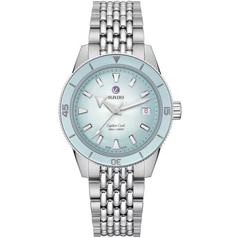 Precision meets style in the Captain Cook —a timepiece built for those who demand performance in every setting. The 39 mm polished stainless-steel case is paired with a polished stainless steel turning bezel and a polished light blue ceramic insert with silver metallised markers. Topped with a box-shaped sapphire crystal, forged at temperatures over 2,000°C and coated with anti-reflective layers on both sides, the crystal offers exceptional clarity and scratch resistance, only surpassed by diamond in hardness. At its core beats the Calibre R763, a self-winding movement developed for uncompromising reliability. Engineered with 25 jewels and regulated in five positions, it ensures precise timekeeping under the most demanding conditions. The movement is equipped with an antimagnetic Nivachron™ hairspring. With a robust 80-hour power reserve, the R763 exemplifies technical mastery and mechanical resilience, embodying the spirit of Swiss engineering and Rado’s continued pursuit of horological excellence. The light blue to silver gradient dial reflects a pure expression of refined aesthetics. Rhodium-coloured indexes and hands are coated with white Super-LumiNova®, while the date guichet at 3 o’clock and the iconic rotating anchor on a ruby backplate underscore the dial’s meticulous attention to detail. The design is completed by a polished and brushed stainless steel rice grain bracelet, secured by a stainless steel 3-fold clasp for a seamless fit. Water-resistant to 30 bar (300 m), the Captain Cook is ready for adventure—uniting Swiss precision with contemporary elegance.