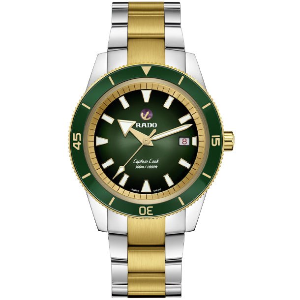 This 42 mm Captain Cook Automatic watch comes with a lacquered green-to-black gradient dial, which perfectly matches the stainless-steel bracelet with yellow-gold-coloured middle links. The rose-gold-coloured hands and indexes with white Super-LumiNova® ensure excellent visibility. For higher accuracy, the Rado R763 automatic movement inside exceeds standard accuracy test requirements from 3 to 5 positions. The polished stainless-steel case with its box-shaped sapphire crystal offers a unique ‘bubble’ effect for a stand-out look. The EasyClip system allows you to change the straps quickly and easily, customising your watch and personalising your style.