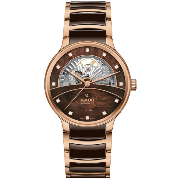 Experience the harmonious blend of artistic expression and design stylings with the Rado Centrix Open Heart watch. As the constellations write their eternal stories above our heads, they build bridges for lovers to meet. A large window, reminiscent at once of dawn and dusk, beautifully frames a state-of-the-art R734 automatic movement with 80 hours of power reserve and an antimagnetic NivachronTM hairspring, as well as a deeply elegant rippled-sunlight "ondulé soleil" motif on chosen component surfaces. The overall appearance of this iconic timepiece is completed with adjusted case lugs and a bracelet made of polished rose-gold-coloured PVD-coated stainless steel with brown high-tech ceramic middle links. The dark brown mother-of-pearl dial with 12 diamonds, emphasised with the rose gold coloured printed “jubilé” logo, matches perfectly with the hands. The watch is water resistant down to 50 m and is also available in M size.