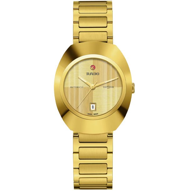 An iconic symbol of Swiss craftsmanship and pioneering innovation. The Rado Diastar is designed for those who dare to embrace the extraordinary. The 30 mm case, crowned by a polished yellow gold-coloured Ceramos™ bezel, merges effortlessly with a polished yellow-gold coloured PVD coated stainless-steel middle case, offering water resistance up to 10 bar (100 metres). The yellow dial, brushed in two directions, plays elegantly with light, highlighting the iconic gold-coloured moving anchor and a meticulously positioned date window at 6 o’clock. Gold-coloured hands with white Super-LumiNova® ensure perfect readability at all times. This refined display is safeguarded by vertical faceted sapphire crystal with anti-reflective coating inside. At its heart lies the automatic R586 calibre, finely regulated in five positions and featuring a Nivachron™ hairspring. This movement delivers a high level of accuracy and 48-hour power reserve. The overall appearance of this iconic timepiece is completed with a yellow-gold coloured, PVD coated stainless-steel bracelet, blending polished links and brushed middle links, secured by a polished yellow-gold coloured, PVD coated stainless steel 3-fold clasp.