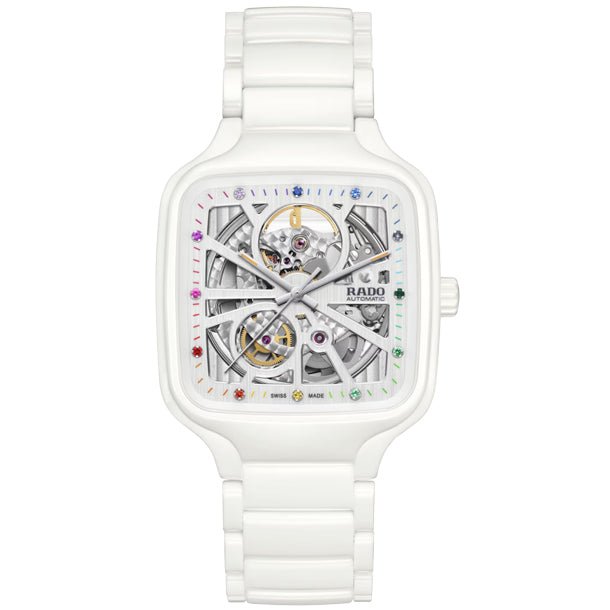 Experience the perfect fusion of artistry and precision with the Rado True Square Automatic Open Heart watch. This remarkable timepiece showcases a captivating open-heart design, allowing you to admire the intricate movements of the automatic Rado calibre R734, with its 80-hour power reserve. With a 38 mm case size, the polished white high-tech ceramic case and crown exude a sleek and contemporary allure. The flat sapphire crystal, with anti-reflective coating on both sides, offers exceptional clarity. The white dial is accentuated by rhodium-coloured bevels. Twelve coloured gemstones add a touch of colour and luxury. The effect is especially impressive as the stones offer dazzling bits of colour in striking contrast to the dial. The rhodium-coloured hands, enhanced with orange Super-LumiNova®, ensure excellent visibility, while adding a subtle touch of elegance. Completing the ensemble is the polished white high-tech ceramic bracelet, offering both comfort and durability.