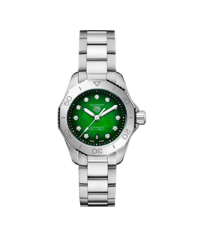 Reminiscent of deep forests, the green, slightly fumé mother-of-pearl of this luxurious 30mm TAG Heuer Aquaracer aspires to go further. Its brilliant diamond indexes add unparalleled style to the robust steel design, crafted for intense achievements.