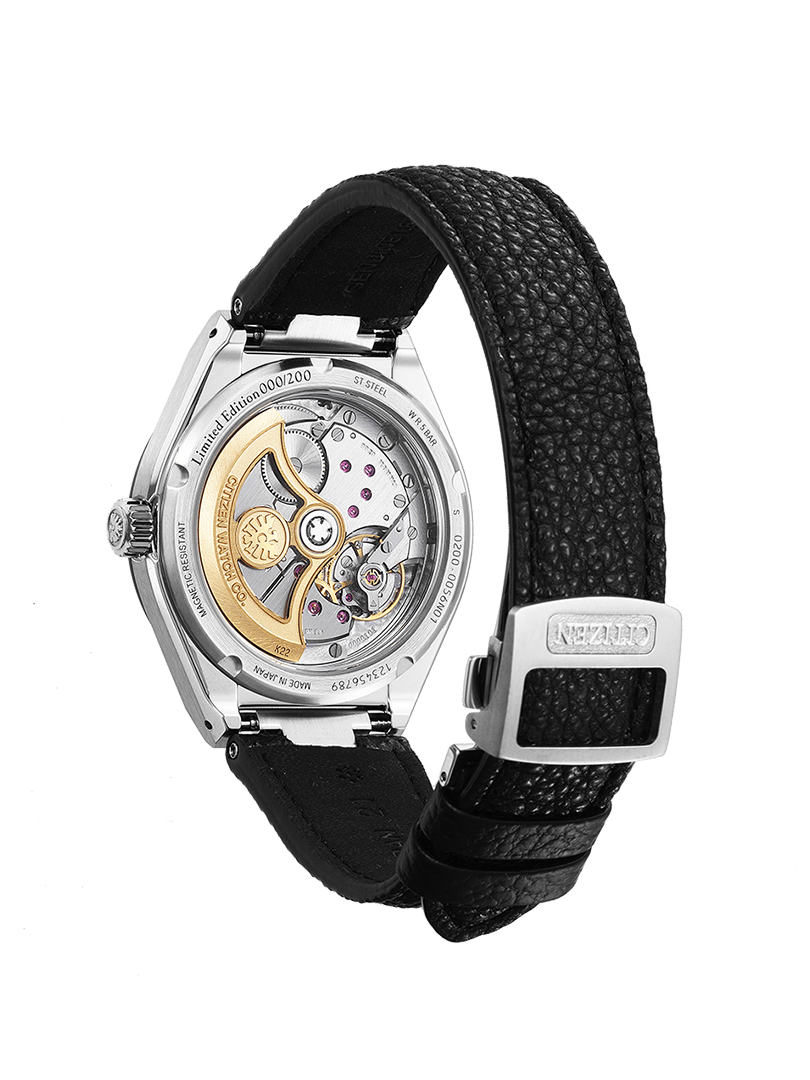 Limited edition distinguished by its strikingly pure white dial. The strap is made of Himeji Kurozan leather, often referred to as the “black diamond of leather.”