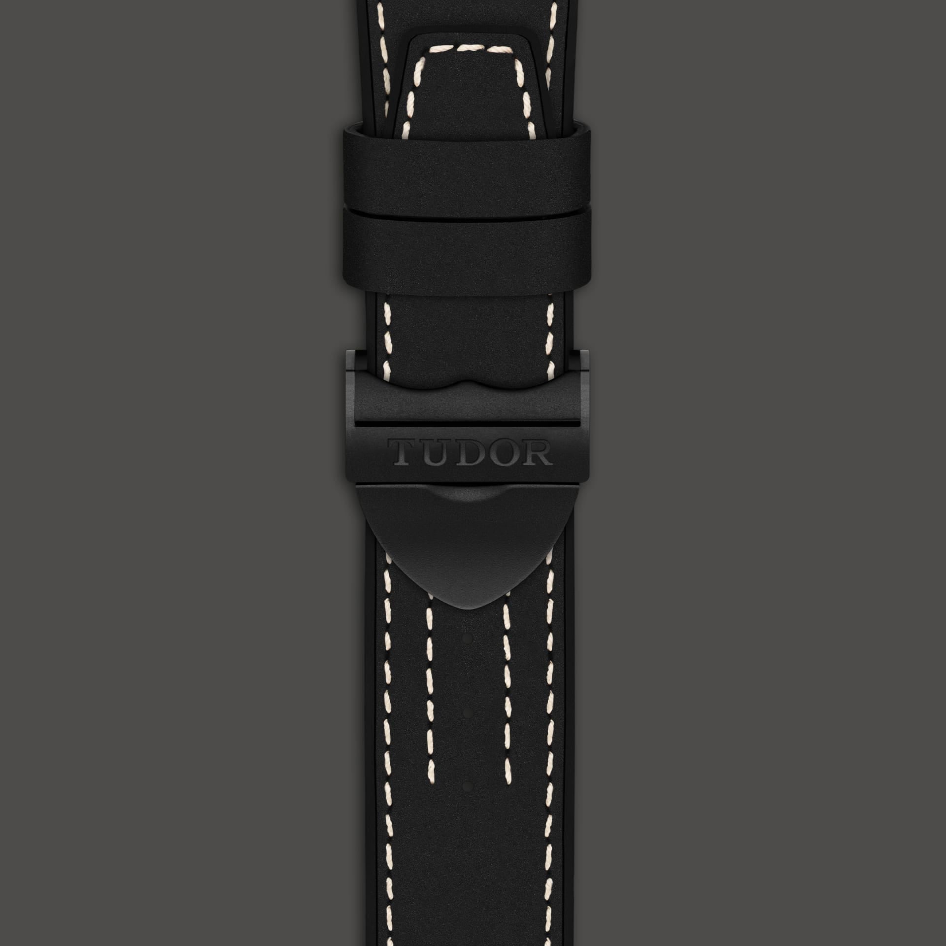 Hybrid leather and rubber strap with steel folding clasp and safety catch in black PVD-treated steel