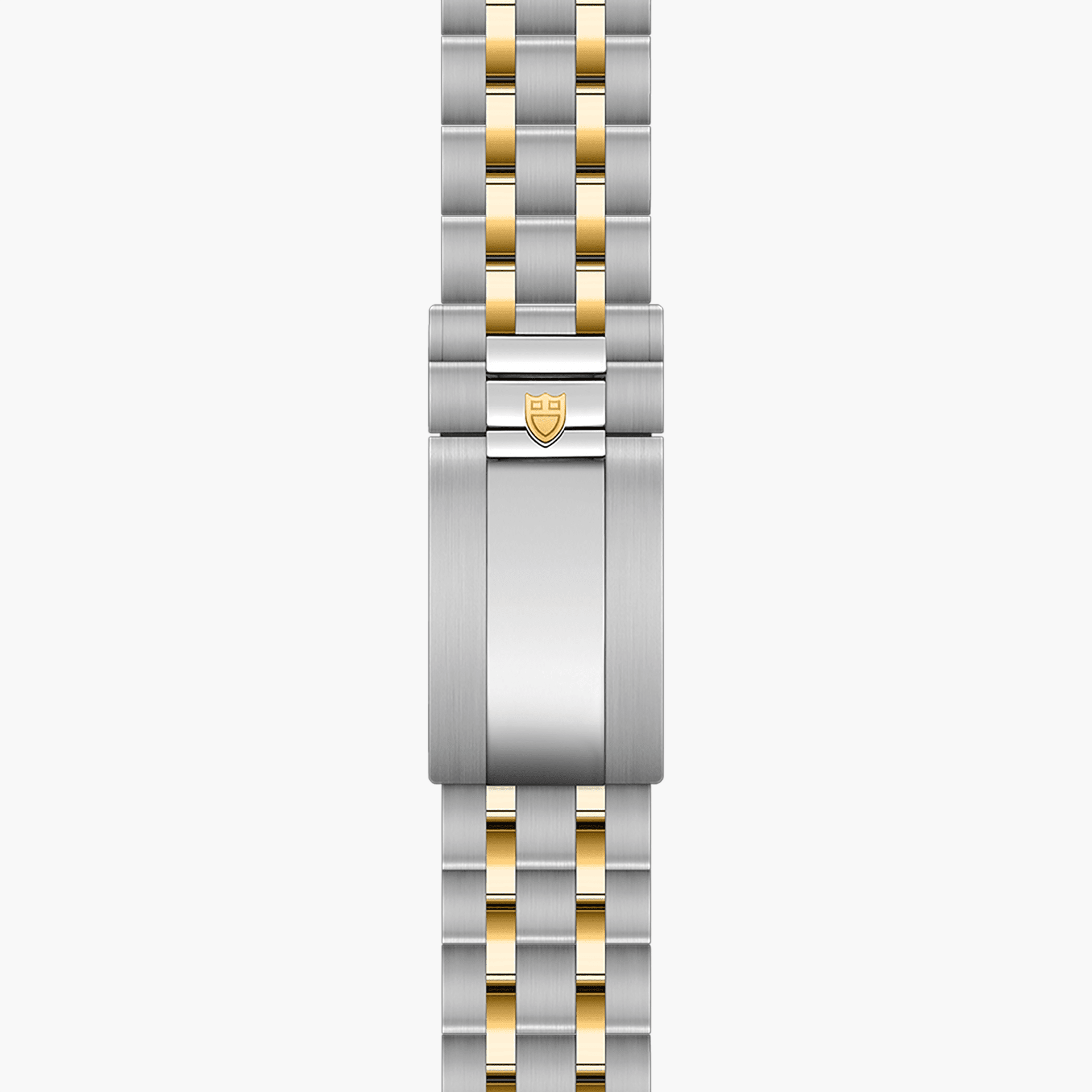 Screw-down winding crown with the TUDOR logo in relief. Steel covered by a 0.1mm yellow gold cap