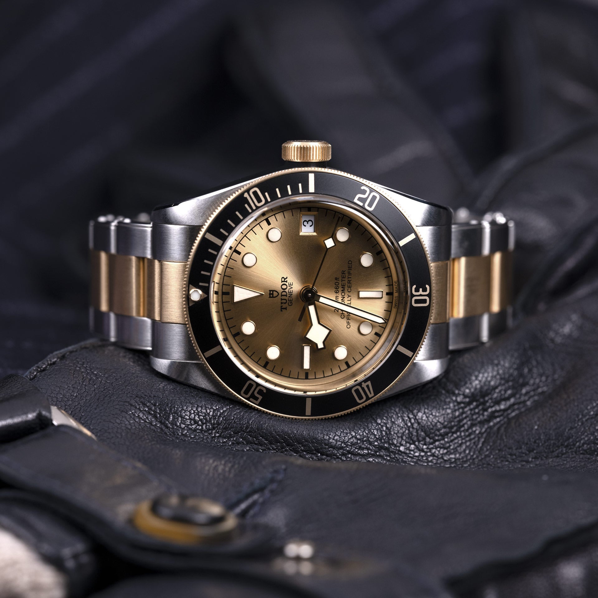 Screw-down winding crown, with the TUDOR rose engraved and lacquered in black, with black anodised aluminium winding crown tube. Steel covered by a 0.3mm yellow gold cap