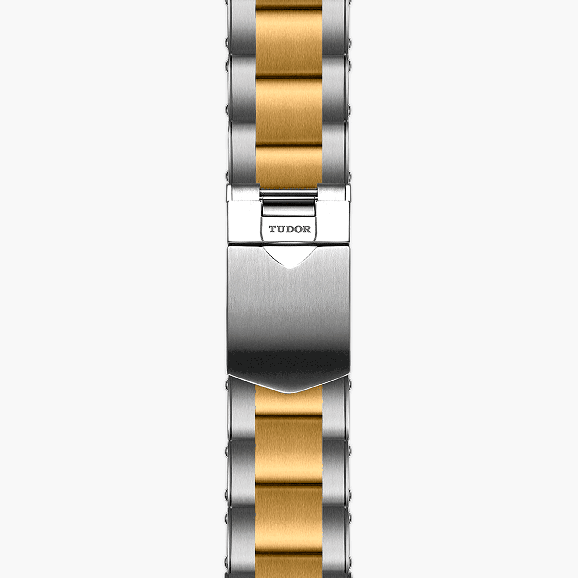 Screw-down winding crown with the TUDOR rose in relief. Solid yellow gold screw-down pushers at 2 and 4 o'clock. Steel covered by a 0.3mm yellow gold cap