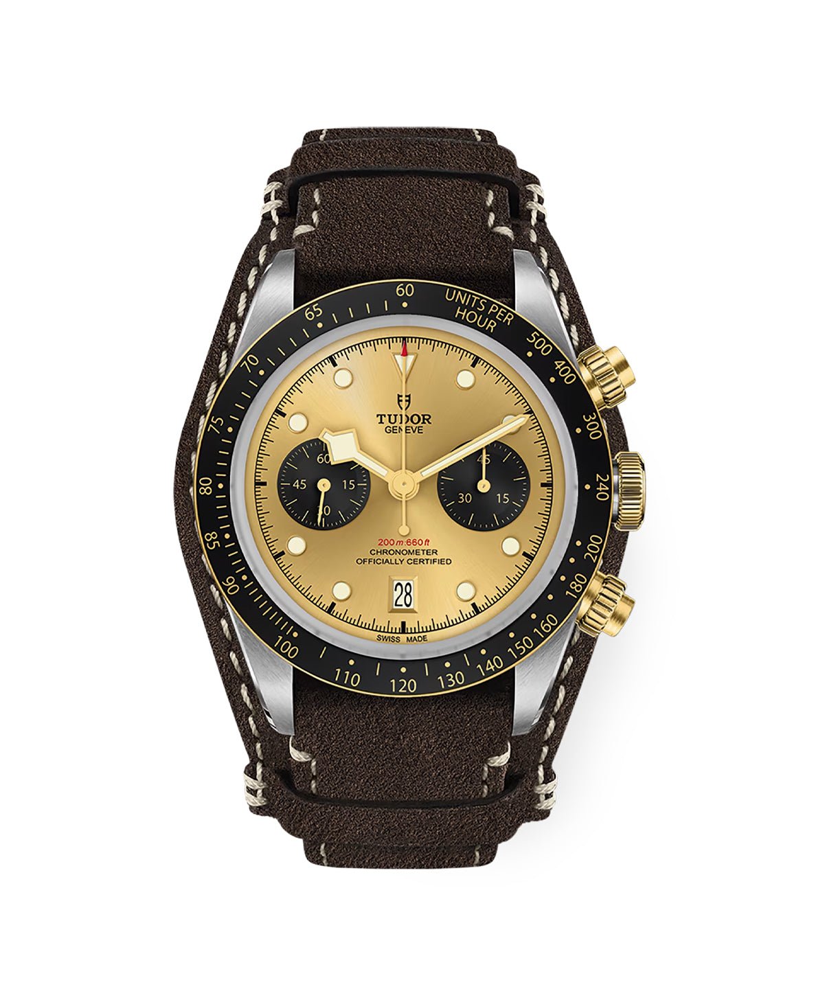 Screw-down winding crown with the TUDOR rose in relief. Solid yellow gold screw-down pushers at 2 and 4 o'clock. Steel covered by a 0.3mm yellow gold cap