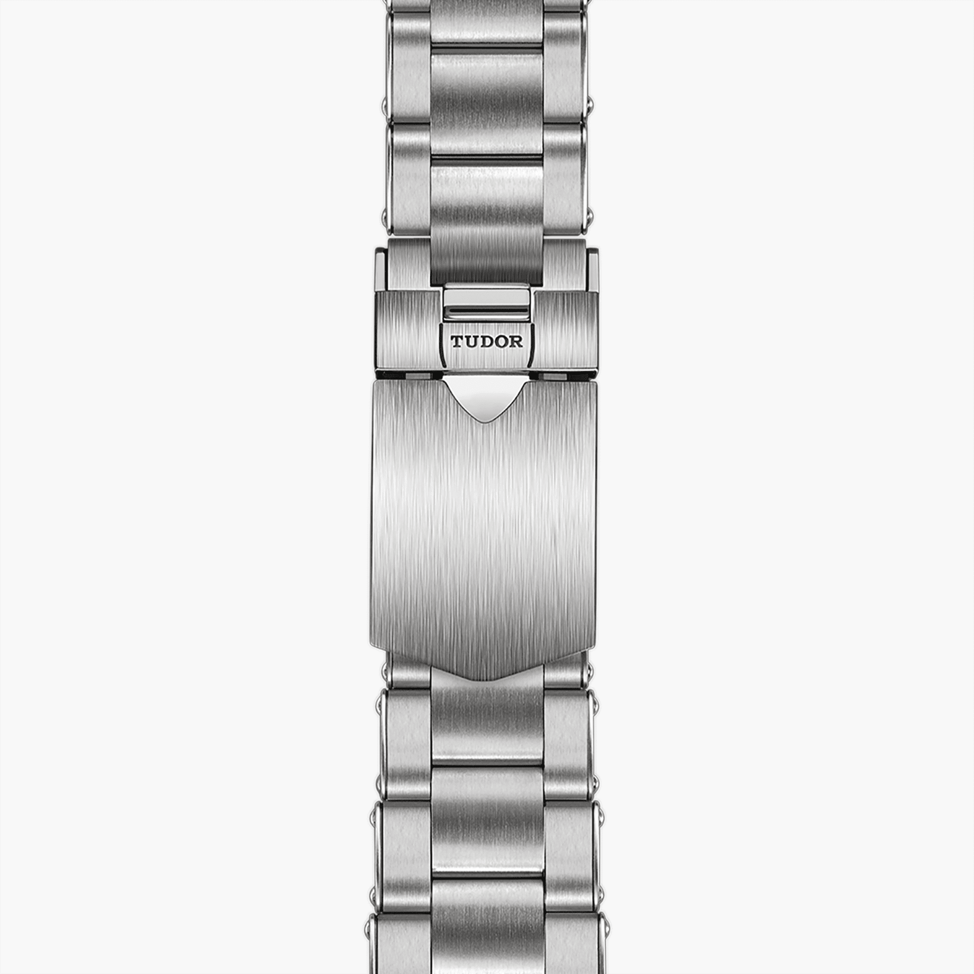 Steel screw-down winding crown, with the TUDOR rose in relief, with circular satin-brushed steel winding crown tube