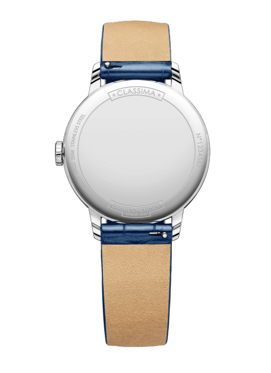 Exquisitely-styled, this 31 mm round ladies moon phase watch comes with diamond-set indices, Roman numerals and a date aperture at 6 o’clock. The moon phase complication with silver colored stars and lunar body, set against a silver dial with a sun-satin finish, offers a lovely allure. The Classima 10329 is delivered on a glossy blue alligator strap and is driven by quartz movement.