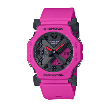A compact G-SHOCK in a boldly straight-forward design that moves style into the future. The tough digital-analog combination GA-2300 goes smaller and slimmer to meet today’s needs, delivering just what you require from a watch in a minimalist design with a futuristic sensibility. With a case measuring just 45.4 mm in diameter and 11.6 mm slim, this G-SHOCK is significantly smaller than past models. Choose the GA-2300 in classic black or white, or go with the GA-2300-4A in vibrant pink with matching LCD. Effortlessly stylish, the GA-2300 holds the key to all-new possibilities with G-SHOCK.