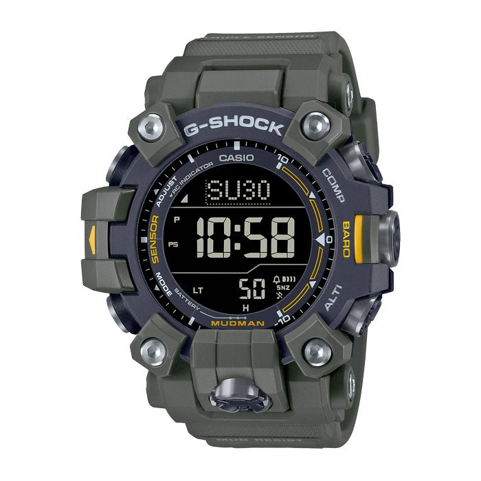 Conquer even more terrain with enhanced support — A rugged timepiece in a bold, powerful, triple-sensor design. The G-SHOCK Master of G line of watches developed for professionals working in the harshest environments introduces the triple-sensor MUDMAN with mud-resist construction. The large, easy to operate front button and three direct sensor buttons on the side are shaped to drain mud and water and are protected by cylinder-shaped stainless steel components. The button shafts are equipped with gasket fittings to keep mud and dust out, as well, so you’re ready to take on the toughest of terrains. The bold design features a dual-layer LCD, as well as the Triple Sensor to deliver altitude, direction, temperature and barometric pressure readings directly to your wrist. The thin module and Carbon Core Guard structure mean all these features live in a slimmer, more compact watch, for tough and rugged support with a comfortable fit. Slim, yet powerful, this MUDMAN design packs full-on functionality in a striking exterior built with an intricate combination of components. The digital compass is more practical than ever thanks to the dual-layer LCD, which displays compass graphics on the top layer and time and other readings on the layer below. The GW-9500-3 and GW-9500-1A4 feature a negative dual-layer LCD. Taking utility to a whole new level, radio-controlled solar power delivers precision timekeeping powered by light, while Super Illuminator ensures visibility, even in dark places. The case, bezel and urethane band are made with bio-based resins derived from renewable organic resources. The case back is engraved with the iconic MUDMAN mole character holding a compass.