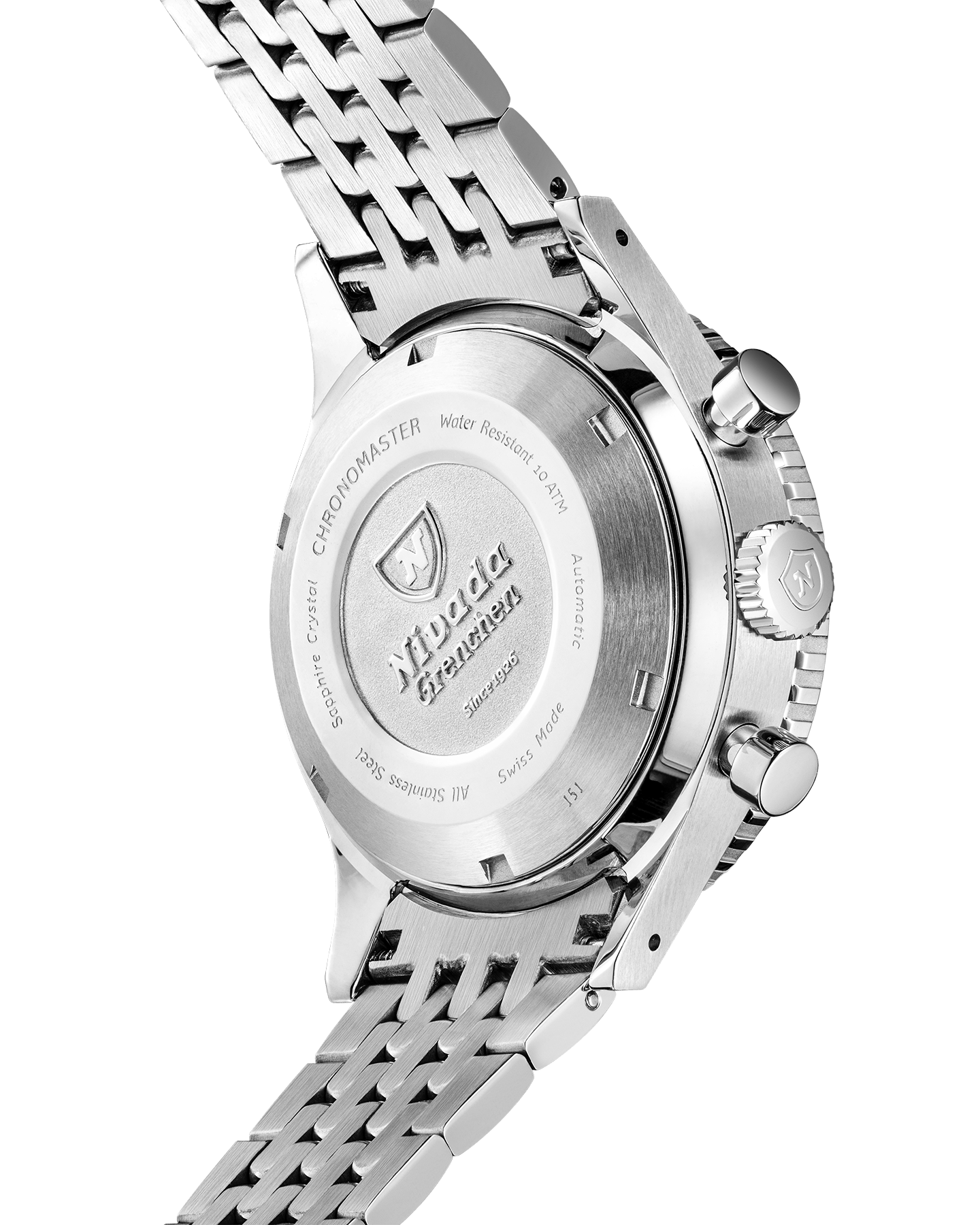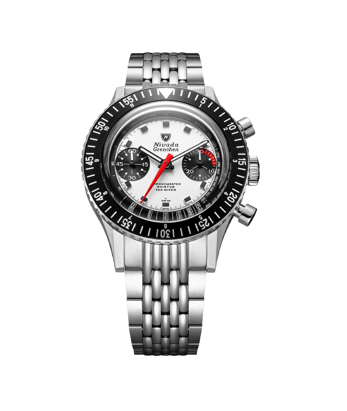 The Chronomaster Broad Arrow 41 mm marks the return of Nivada Grenchen’s most emblematic chronograph now re-engineered for a new generation of collectors. With its expanded 41 mm case, Landeron 72 automatic movement, and signature Broad Arrow dial, this Big Size edition offers the perfect balance of vintage charm and modern performance. Its 316 L stainless-steel case, alternating polished and brushed surfaces, houses a double-domed sapphire crystal for optimal legibility and durability. The bi-directional bezel and 100 m water resistance make it as functional as it is iconic.