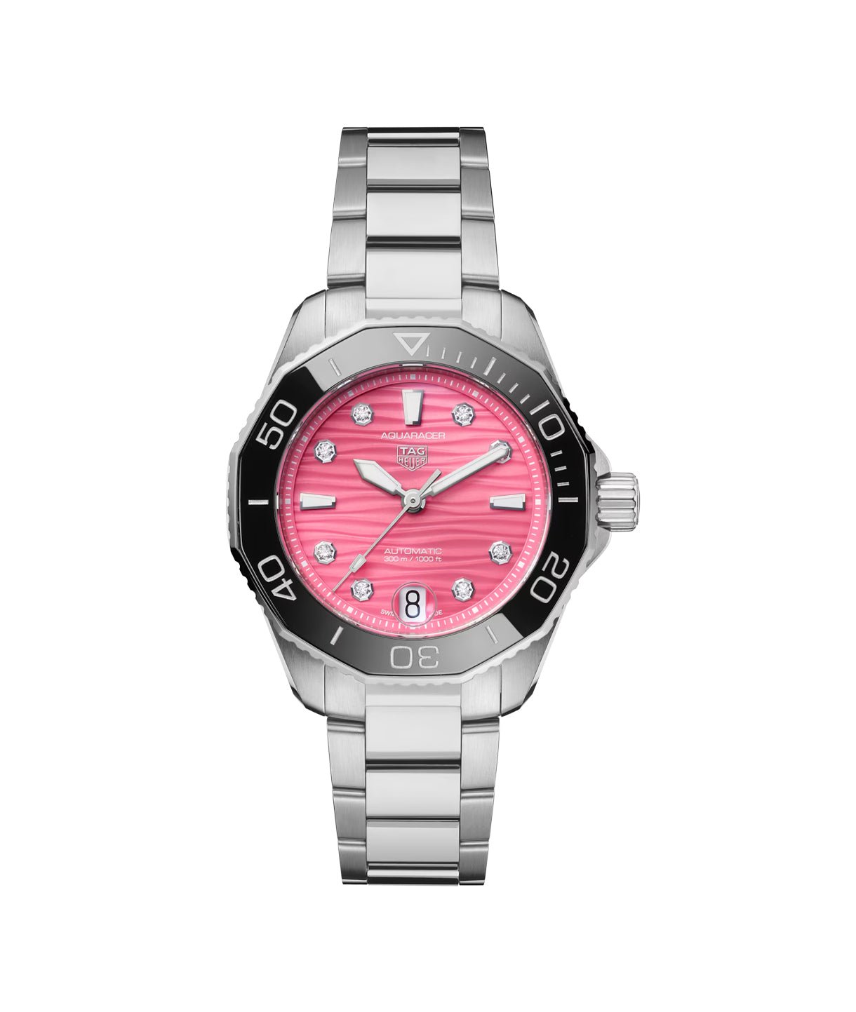 A true diving watch, this TAG Heuer Aquaracer makes a splash with its 36mm case and a fresh dial in bold pink. Featuring a wave motif, this pressure-proof professional model can endure any conditions and is an essential ally in your achievement.